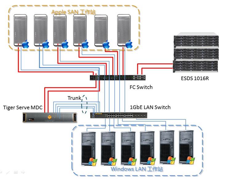 近幾年,英大傳媒高速發展,業務模式及品質的不斷提升,其編輯部門的非線性資料儲存容量和性能需求呈顯著增長。在此專案中,客戶針對編輯環境的需求,目前有10蘋果系統的非編網站,未來有可能會擴展至15 – 20個網站, 每一網站的頻寬性能需求50MB/s。還有10台Windows非編網站,未來擴展至20台。每個網站的頻寬性能需求25MB/s。且要求儲存空間可達100TB以上。