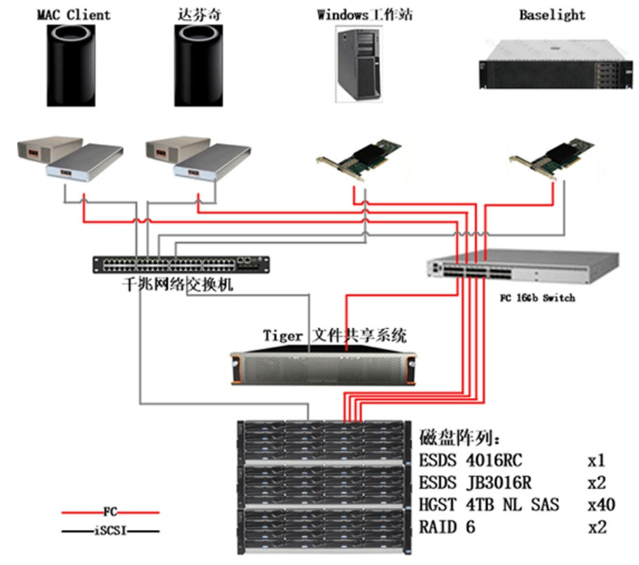ESDS 4016RC磁碟陣列加擴充櫃的方式,同時搭配Tiger檔共用系統,構建一套SAN的共用平臺,採用最新的FC&SAS技術,來支撐大量的線性編輯。環境中用一台windows 伺服器做專用MDC,並支援windows、linux、MAC跨平臺同時應用。