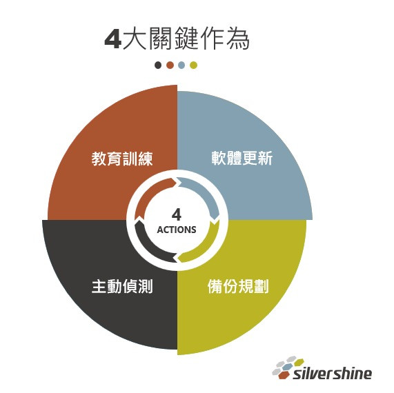 在過去面對資安的防護,大多數企業一定都有基本的規劃,像是防火牆、防毒軟體等等。但是面對到勒索病毒的多樣攻擊手法,其實可從四大關鍵作為下手。