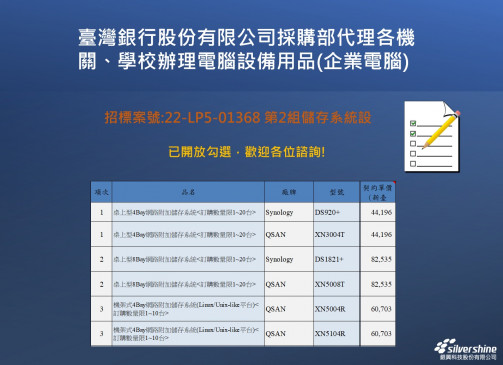 中央各機關共同供應契約開跑囉!→ 電腦設備用品 LP5-111004 第二組儲存設備已可開始勾選。歡迎與我們聯繫諮詢02-87926128 項次 品名 廠牌 型號 產地 契約單價 (新臺幣;含稅...