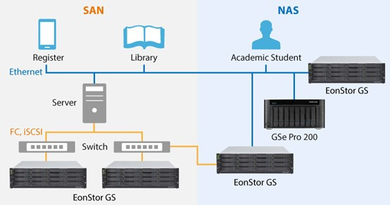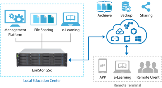學生與教職員對於完善的 IT 架構需求與日俱增,然而預算及 IT 資源有限,更需要部署可彈性使用及實惠的資料儲存方案,方能事半功倍。EonStor GS 及 GSe Pro 整合儲存系列機種可進行檔案分享、數位學習,更可進行數位圖書館等檔案層級 (NAS) 及區塊層級 (SAN) 應用。儲存容量可擴充至 1,792 顆硬碟或大於 20 PB 的原始容量。此外,更提供豐富的傳輸連線介面、機型尺寸及雲端閘道器功能,滿足目前及未來的校園需求。